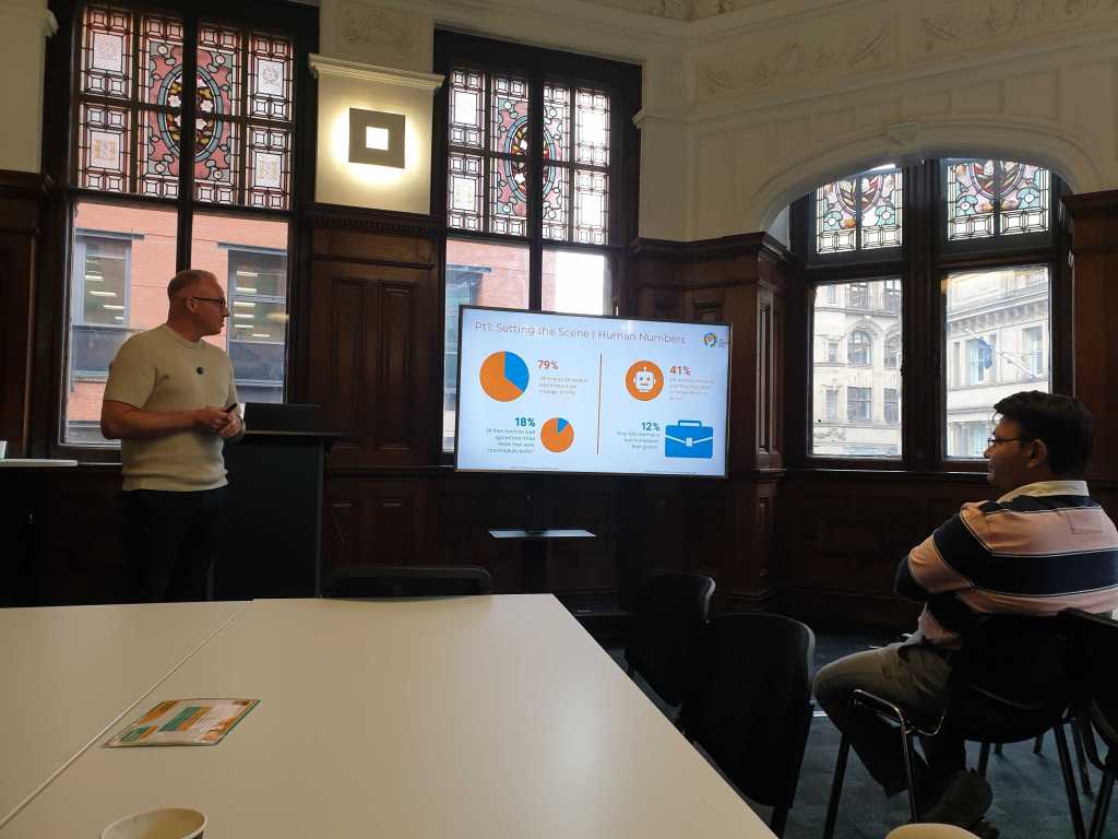 Setting the Scene, the talk reveals a significant disconnect between AI hype and its real impact on employees. While 79% of UK enterprise leaders prioritise AI, only 18% of frontline workers feel it improves their jobs, and 41% fear it may worsen or eliminate their roles. This misalignment, termed “the gap” is the chasm between technological potential and human acceptance. Despite soaring global AI investment, only 25% of organisations achieve meaningful business outcomes, highlighting the need to focus on human purpose and adoption.