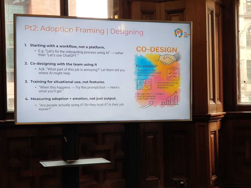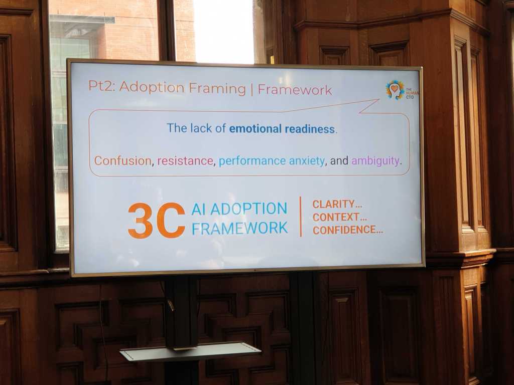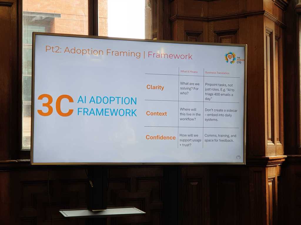 Adoption Framing That Actually Works focuses on rethinking AI deployment. Too often, companies focus solely on technical rollouts, neglecting the people who must use the tools. Successful adoption hinges on designing AI for people, not just processes. The speaker recommends five key questions before implementing AI, challenging organisations to assess who benefits, where inefficiencies lie, and what skills are required. A “3C Framework” — Clarity, Context, Confidence — underpins this approach. Practical tips include designing around workflows, involving staff in solution creation, providing situational training, and measuring emotional as well as operational outcomes. Tools like the “Fear Map” are used to surface anxieties and hopes before rollout.