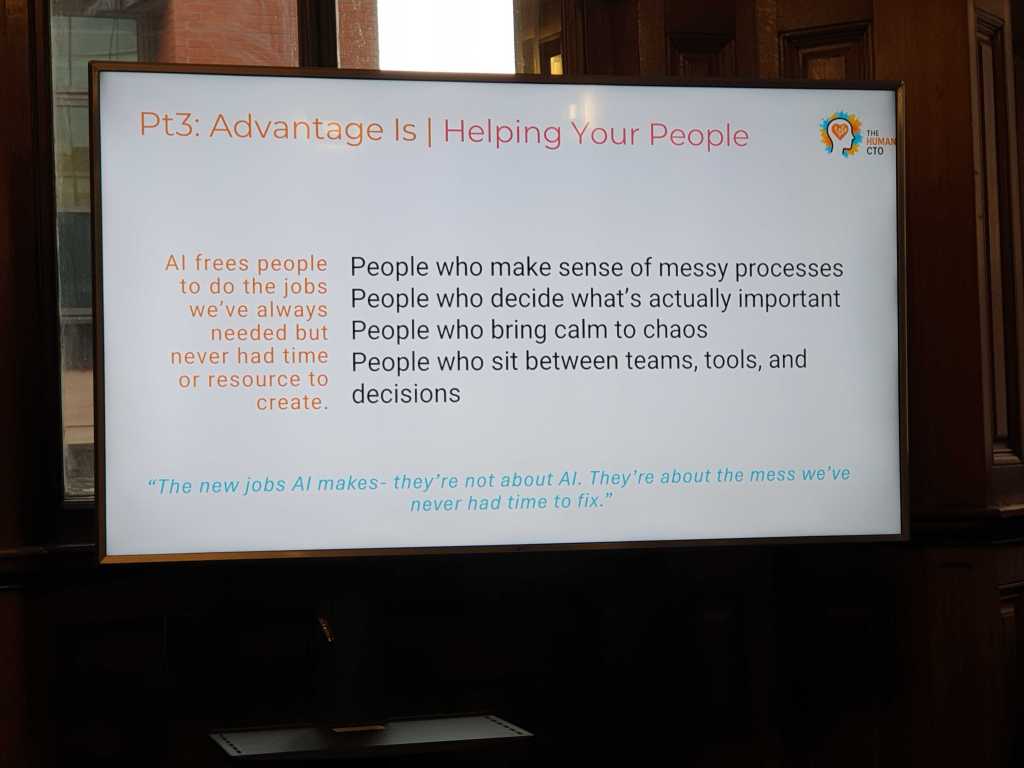 The Advantage is Not AI, It’s People, the talk stresses that AI success depends on simplicity, meaningful adoption loops, and reinforcing confidence rather than compliance. AI should enhance good processes and reveal weaknesses in poor ones. Importantly, AI is portrayed not as a replacement for people but as an enabler, freeing staff to perform valuable tasks previously overlooked. Roles that bridge chaos, make sense of complexity, and connect teams are highlighted as the true human advantage in the AI era.