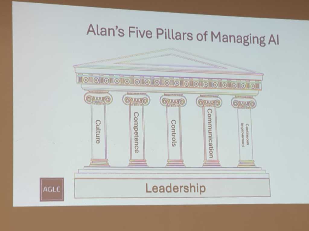 Managing AI responsibly is a central theme. Gillies outlines his Five Pillars of Managing AI—culture, competence, controls, communication, and continuous improvement—anchored by effective leadership. Good practice requires organizations to treat AI as a shared responsibility, assess staff competency, monitor and adapt risk management processes, ensure open communication, and continually learn from failures.