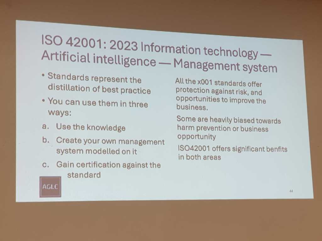 He also highlights the significance of ISO/IEC 42001:2023, the new standard for Artificial Intelligence Management Systems (AIMS). This framework emphasizes ethical AI, risk management, governance, and compliance. Organisations can use it as guidance, a model for internal systems, or pursue certification, thereby both reducing harm and creating opportunities.