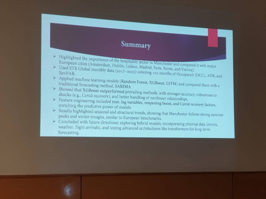 This study investigates the performance of Manchester’s urban hotel sector using machine learning techniques, benchmarking it against major European cities—Amsterdam, Dublin, Lisbon, Madrid, Paris, Rome, and Vienna. It aims to create robust forecasting models for key hotel performance indicators (KPIs) and offer strategic insights into enhancing Manchester’s hospitality competitiveness.